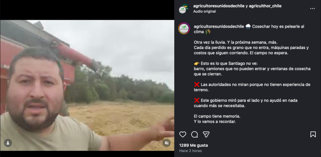 La publicación también incluye un cuestionamiento directo al Ejecutivo: “Este gobierno miró para el lado y no ayudó en nada cuando más se necesitaba”, acusación que se enmarca en un escenario de reiteradas demandas del sector agrícola por apoyo ante eventos climáticos adversos.