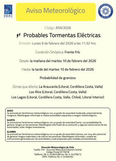 Según el comunicado oficial, el aviso por probables tormentas eléctricas estará vigente desde la mañana hasta la tarde del martes 10 de febrero, y se concentra en áreas del litoral, valle y cordillera de las regiones de La Araucanía y Los Ríos, así como en el litoral, cordillera de la costa, valle, Chiloé y litoral interior de Los Lagos. En estos sectores también existe la “probabilidad de granizos”, lo que aumenta la necesidad de cautela para actividades al aire libre y desplazamientos.