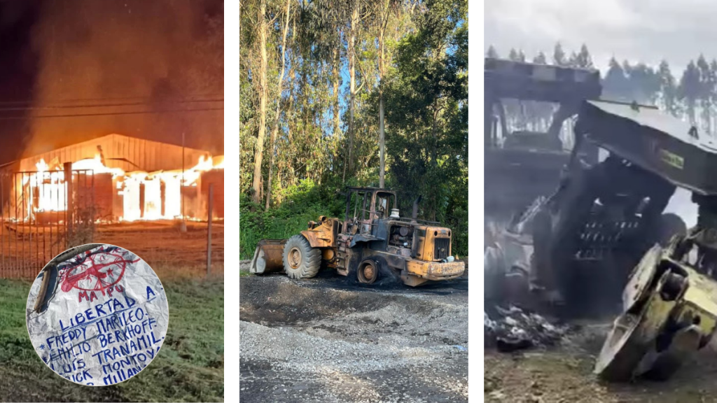 Minutos después del primer ataque en Vilcún, Carabineros detectó un segundo incendio en un predio cercano, donde también se encontraron lienzos con mensajes políticos. La madrugada del sábado, en tanto, desconocidos incendiaron maquinaria pesada en Carahue, mientras que el domingo fueron quemadas siete máquinas forestales en Cunco, según la Brigada de Investigaciones Policiales Especiales (BIPE) de la PDI.