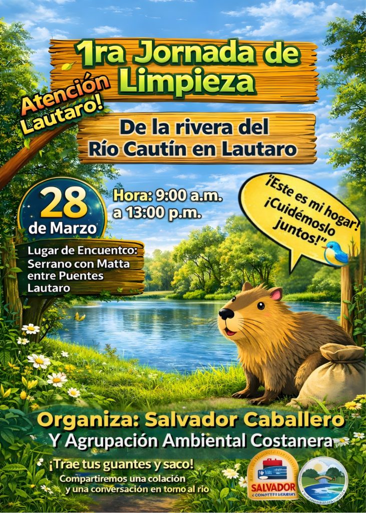 Una jornada de limpieza en la ribera del Río Cautín se realizará el próximo 28 de marzo en la comuna de Lautaro, en una iniciativa impulsada por vecinos y organizaciones sociales que buscan recuperar este espacio natural y generar conciencia sobre su cuidado. La actividad, programada entre las 09:00 y las 13:00 horas, tendrá como punto de encuentro la intersección de las calles Serrano con Matta, desde donde se desplegarán los equipos de trabajo hacia distintos sectores de la ribera.